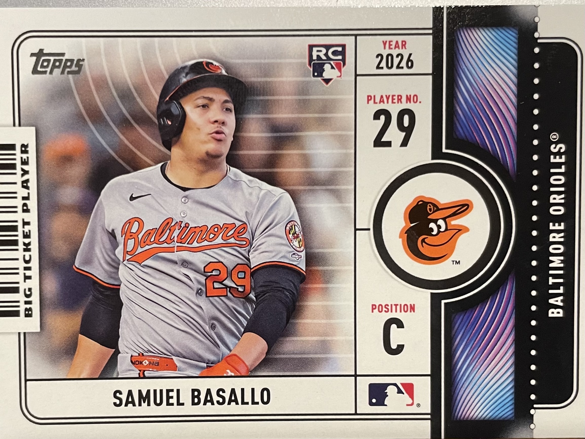 Speaking of chase cards, here’s another one. I’ll admit that it’s pretty cool looking. It’s part of a series called “Big Ticket Players,” and the card is a stylized design reminiscent of a movie or concert ticket. Apparently there are 26 of these players, ranging from prospects like Basallo to bonafide stars like Judge. Unfortunately I got Basallo.